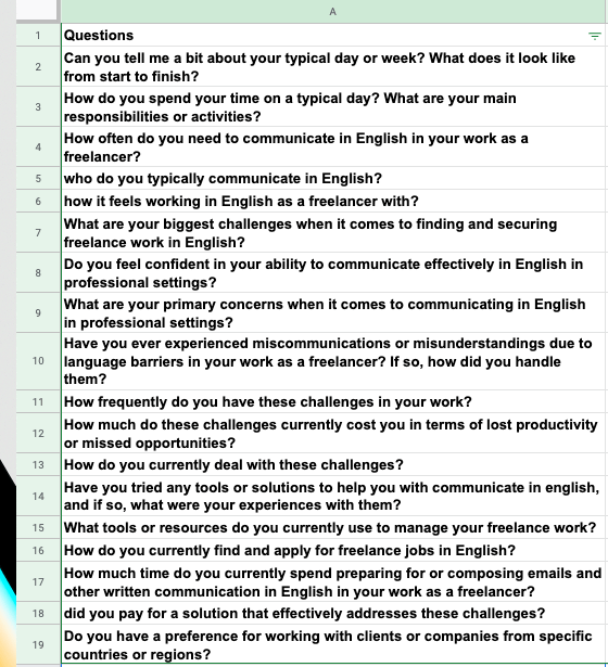 To make sure that my assumptions about this market are accurate, I created a questionnaire to interview around 20 freelancers who are native Spanish speakers and proficient in English. This is known as the “The mom test” where you ask someone about their experiences without telling them what you’re doing in order to validate your product.